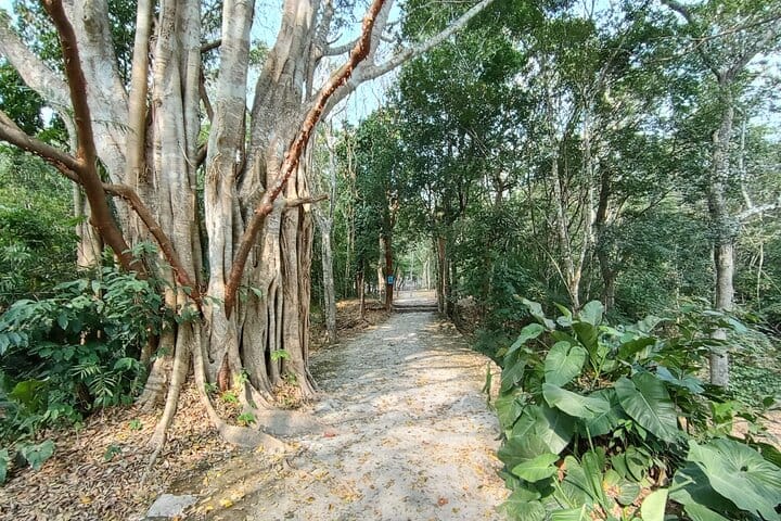 The highlight of the tour is the majestic pyramid-temple, a striking structure that dominates the site and offers a direct glimpse into the grandeur of the Maya civilization. Its jungle surroundings—palm trees, dense vegetation, and natural silence—add a touch of authentic adventure. Visiting Becán is not just about seeing ruins; it is an immersive journey into the Maya world.
