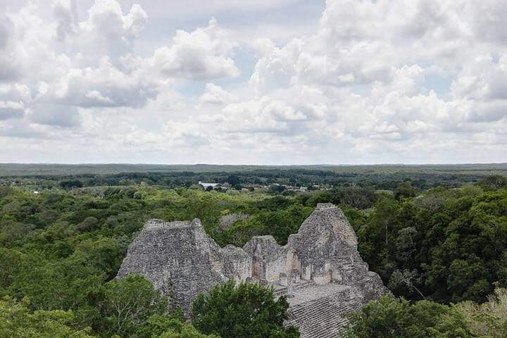 Upon entering the site, you will be amazed by its impressive defensive moat—a natural wall of earth and stone surrounding the ceremonial center—unique among all Mayan cities. Inside, you will walk through ceremonial plazas, residential complexes, and monumental structures showcasing the distinctive Río Bec architectural style: tall towers, false temples, steep staircases, and an atmosphere that evokes distant times.